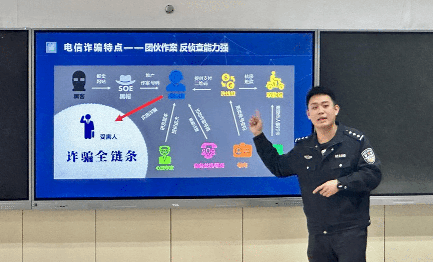 太原市公安局反诈骗中心马语峰警官以典型案例为教材,以案说法、以案促法,通过案例讲解和有奖互动问答环节,围绕“什么是电信网络诈骗,如何预防电信网络诈骗以及常见的诈骗手段防范措施”,深入浅出地向学生们揭示了电信网络诈骗的危害,用通俗易懂的言语对大学生群体中案发率较高的“机票改签、网络赌博、刷单返利、贷款、代办信用卡、冒充电商物流客服、网络交友类诈骗(杀猪盘)”等诈骗方式,深入剖析,详细介绍了诈骗的作案手法及防范要点。同时,向学生们介绍了国家反诈中心APP和反诈微信小程序,帮助大家进一步“擦亮双眼”,有效提升反诈能力