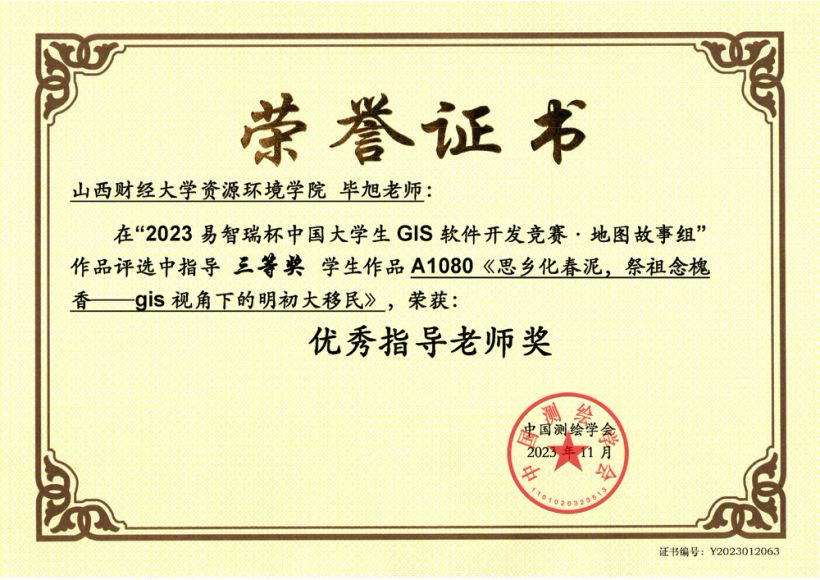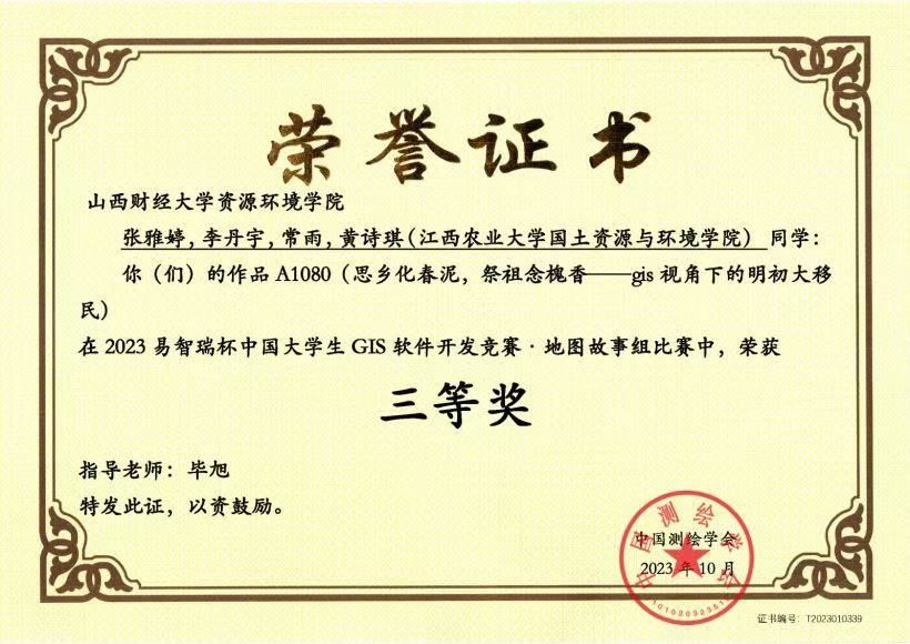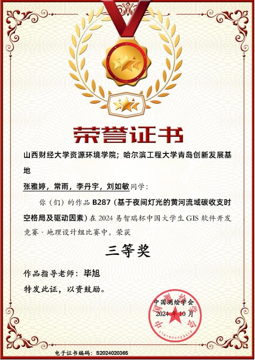 2024年“易智瑞杯”中国大学生GIS软件开发竞赛评选结果正式揭晓!必威西汉姆联2021地理信息科学专业张雅婷、常雨、李丹宇三位同学的作品《基于夜间灯光的黄河流域碳收支时空格局及驱动因素》荣获地理设计组三等奖。其中,该团队成员在2023年“易智瑞杯”中国大学生GIS软件开发竞赛中作品《思乡化春泥,祭祖念槐香——gis视角下的明初大移民》荣获地图故事组三等奖。以上荣誉不仅是对团队成员辛勤付出的肯定,更是对我院在培养高素质GIS人才方面所取得成绩的认可。指导教师毕旭老师荣获“优秀指导老师”奖项,她的专业指导和无私奉献为团队成功奠定了坚实的基础。