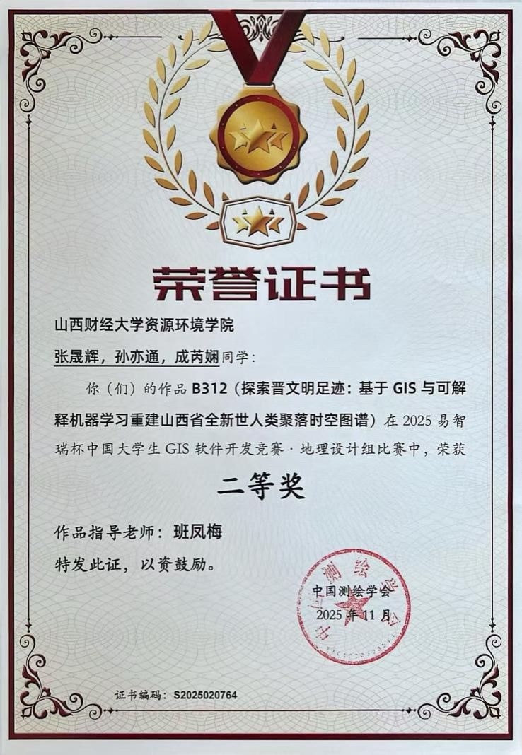 近日,2025年“易智瑞杯”中国大学生GIS软件开发竞赛圆满落幕。本届竞赛作为中国GIS领域最具影响力的创新型赛事,数千名优秀学子同台竞技,必威西汉姆联2023自然地理与资源环境班张晟辉、孙亦通,2022自然地理与资源环境班成芮娴三位同学表现优异,团队参赛作品《探索晋文明足迹:基于GIS与可解释机器学习重建山西省全新世人类聚落时空图谱》,凭借扎实的研究基础与创新的技术融合,在全国众多参赛作品中脱颖而出,荣获地理设计组全国二等奖,作品指导老师班凤梅教授荣获“优秀指导老师”奖。