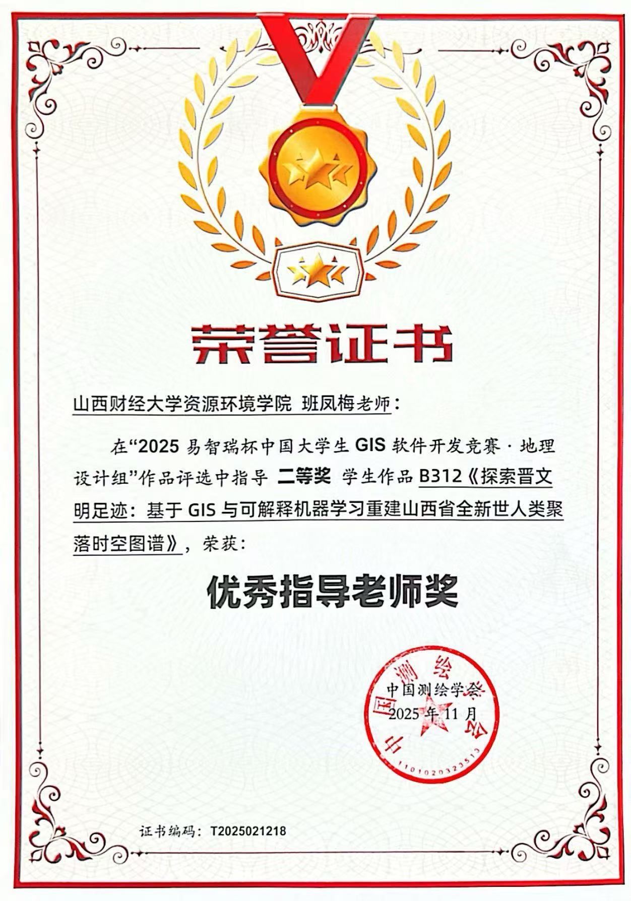 “易智瑞杯”中国大学生GIS软件开发竞赛是由中国测绘学会主办的国家级高水平赛事,本届竞赛共设四个主赛道,吸引全国200余所高校、近两千支队伍参赛。我院学子将课堂所学与实际问题紧密结合,围绕生态保护、城乡发展、文化遗产、公共治理等现实议题展开研究,体现了扎实的专业能力与学以致用的实践精神。
