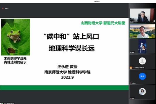 汪永进教授的报告聚焦前沿,内容丰富,深入浅出,使我院师生深入了解了全球“碳中和”问题的提出及该领域内国内外重点关注的科学问题,对我院申请相关科研项目、撰写相关学术论文具有重要的指导意义。同时,他对我校在财经院校办地理学科给予了充分的肯定,指出在财经院校办地理学科,可以充分凝聚经济学和地理学的学科优势,更好地服务于当今国家双碳目标和黄河流域高质量发展等重大战略需求,增强了我校及我院地理学科建设的信心,也为地理学科建设和特色学科方向凝练指明了方向。