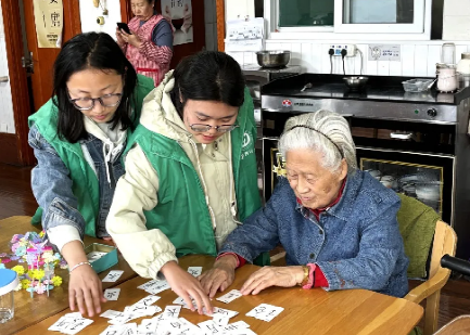 乐纸牌游戏 : 纸牌在指尖翻转,笑声在此刻定格。志愿者们与老人们一起享受着纸牌游戏带来的欢乐。在纸牌的世界里,老人们回忆青春,志愿者们忘却烦恼。整个房间笑声回荡,仿佛回到了那无忧岁月中。这小小的游戏,承载着大大的幸福。