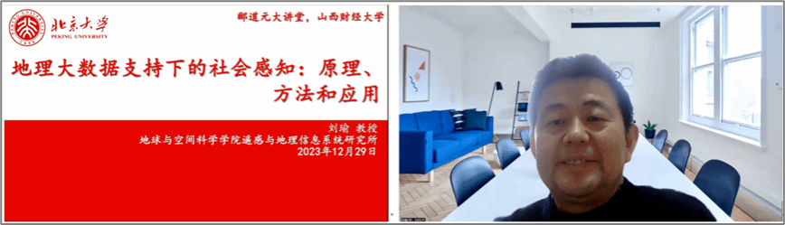 2023年12月29日下午,北京大学博雅特聘教授刘瑜受邀为郦道元大讲堂带来跨年学术盛宴。本次讲座的主题为“地理大数据支持下的社会感知:原理、方法和应用”,报告采用线上方式举办,吸引了约200名师生和学者参加了此次报告。必威西汉姆联院长班凤梅主持了此次讲座。